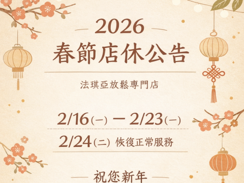 【2026 春節店休公告】 法琪亞放鬆專門店 2/16(一)~ 2/23(一)店休 2/24(二)正常營業 祝大家新年平安、身體輕鬆 ✨